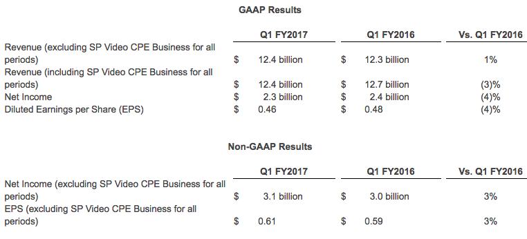 按美国通用会计准则计算(GAAP),净利润为23亿美元,比去年同期的24亿美元下降4%;每股摊薄后利润为0.46美元,比去年同期的0.48美元下降4%。按美国非通用会计准则计算(non-GAAP),包括SP VIdeo CPE业务的净利润为31亿美元,比去年同期的30亿美元增长3%;每股摊薄后利润为0.61美元,比去年同期的0.59美元增长3%。