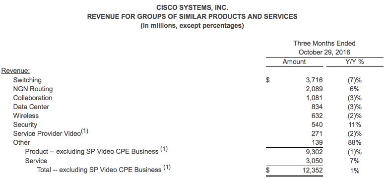按具体的产品和服务来看,来自交换机业务的营收为37.16亿美元,是营收最高的业务,但相比去年同期下降7%。此外,协作业务、数据中心、无线网络及视频业务,营收相比去年同期都出现不同程度下滑。