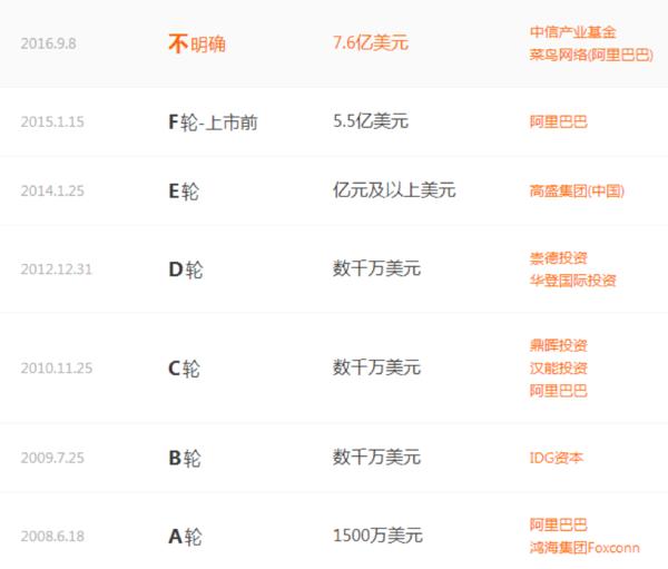 自成立以来,百世物流共获得了7轮融资。2008年,百世物流获得阿里和富士康1500万美元融资。此后,前者在C轮、E轮、F轮和最新一轮融资中有小幅追加。