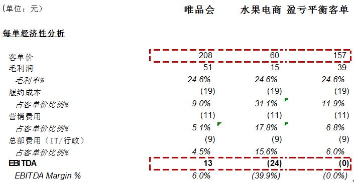 同样道理分析下生鲜电商。对大部分生鲜电商来讲,往往有一个核心品类占比80%以上。比如最常见的是水果,这个品类的线上客单价一般在30-60元不等。如果我们取区间上端60元,暂时假设水果电商的毛利率、每单的履约成本/营销费用/总部费用和唯品会同一水平,那么水果电商每单会亏损24元。如果要做到盈亏平衡,客单价至少要做到接近160元。所以客单价必须要提高。