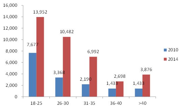 到了2014年(注:如果读者有2015更新数字欢迎提供),电商人口的年龄结构在这4年内又发生了巨大的变化。首先是原来25岁以下的人口,大部分已经跨入了25-30的年龄段,并且该年龄段人数增加到了1.05亿;同时,原来26-30岁年龄段的人口也进入31-35岁年龄段,并且该年龄段人数增加到了接近7000万。于是,4年之内,25-35岁之间的电商人口合计从原来的5000多万翻了三倍增加到了1.7亿。