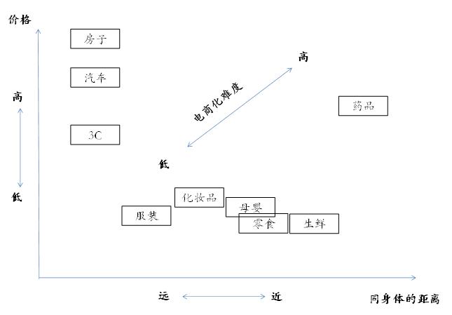 首先从品类属性上看,我们在看某个品类的电商化难度时,会经常使用客单价和同身体的距离两个维度考虑,即随着客单价的提高和同身体距离的缩短,电商化的难度也就越来越高。选择这两个维度,是因为客单价衡量购买的现金成本,而同身体的距离衡量安全风险,即消费者购买时需要克服的心理难度。所以这就不难理解为什么阿里和京东分别以服装和3C品类起家了,因为客单价和同身体的距离表征的难度都较小。