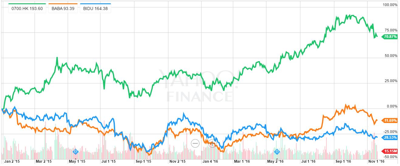 从2015年年初开始至今,腾讯股价涨了约70%;阿里股价跌了约10%;百度股价跌了约30%。