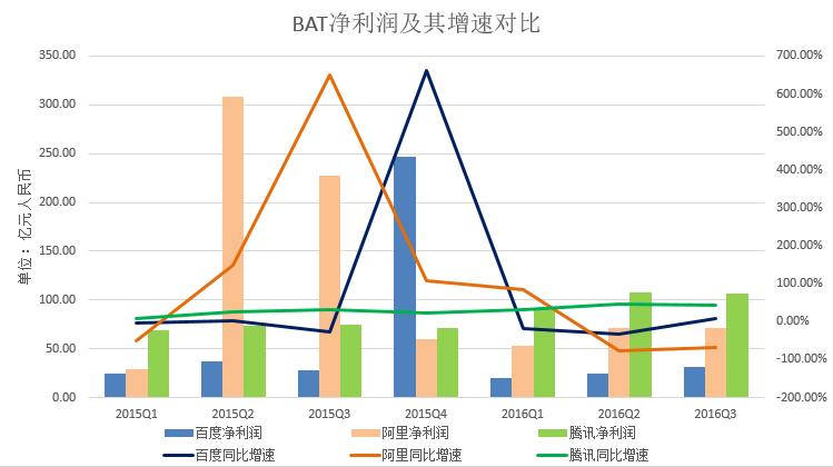 百度2015年四季度净利润暴增是因为与携程置换去哪儿股权带来了净收入;阿里2015年第二和第三季度利润的暴增则是因为剥离阿里影业带来的资产处置收益和重新评估持有阿里健康的资产收益。