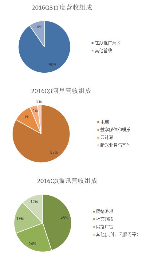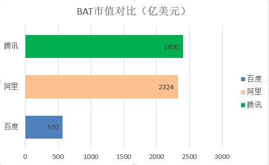 从市值上看,腾讯和阿里的市值相近;百度仅为前两者的四分之一。