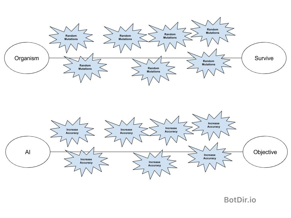 为了更好理解这种对比(自然进化与机器进化), 我们可以将机器学习中必需的数据集合看作「自然环境」,把训练步骤看作「自然选择」。训练过程可以是监督学习或无监督学习,强化学习,聚类算法、决策树或是不同的深度学习方法。