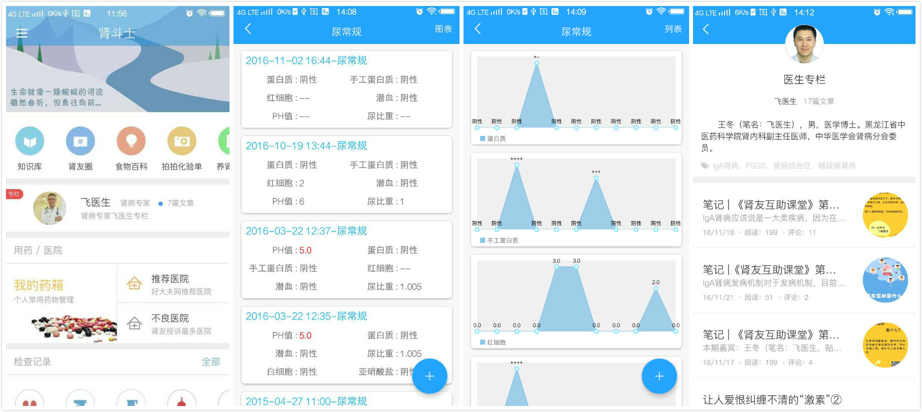 一开始,肾斗士主要做的是线上肾病管理平台,包括ios和安卓APP、微信公众号等,内容包括肾医的知识科普(医生专栏、翻译)、肾友社区、食物百科(营养成分、饮食禁忌)、康复笔记(患者随笔)、养肾计划(八段锦、太极、健步走等音、视频锻炼资料)、化验单管理(纸质版拍照上传、关键指标记录)等。