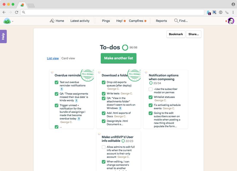 不管角色如何,每一个人都在同一个地方工作,在同一个地方沟通等。对于我们来说这个地方就是Basecamp 3。当所有人都在同一个地方时,每个人都知道东西在哪里,事情到底怎么回事,而且每个人都可以自给自足。把工作、沟通和管理分散到不同工具/产品进行会1)非常低效;2)对于整个团队来说很难看到全局情况。