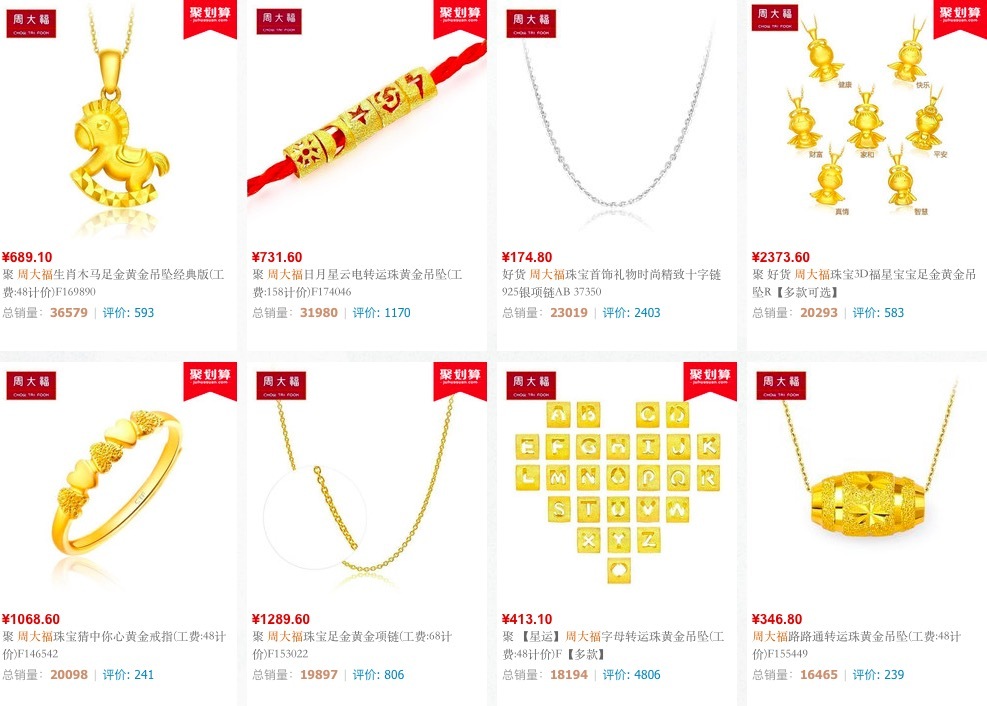 最为常见的是向上从电商借力,并采取一定的促销活动来吸引消费者参与进来。像周大福就在天猫开设了官方旗舰店,在周大福天猫旗舰店中,按照商品销量排名,最高销量数为36579,售价在174-2374元之间。可以看出排在前几名销量的产品中,具有两个特点:通过聚划算做促销、低价偏多。