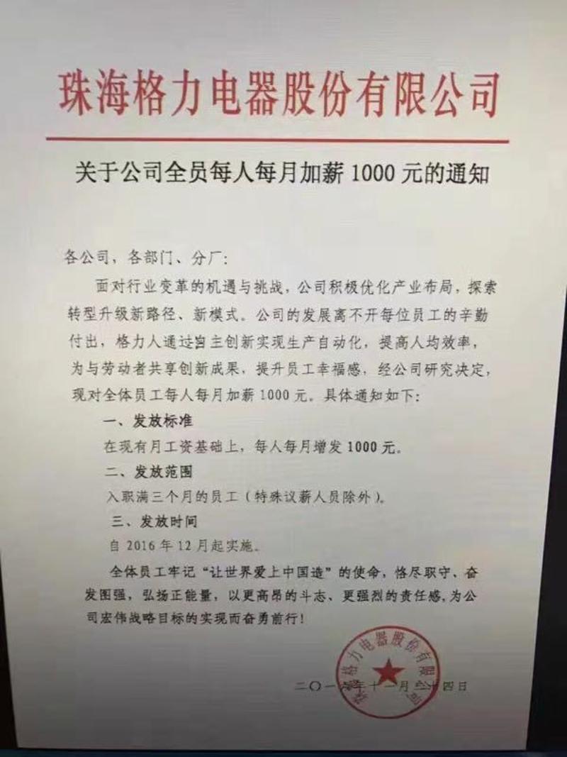 如下图所示,这是一份署名为珠海格力电器股份有限公司的《关于公司全员每人每月加薪1000元的通知》。文件内容显示,从2016年12月起,在现有月工资的基础上,格力电器将对入职满三个月的全体员工(特殊议薪人员除外),每人每月加薪1000元。