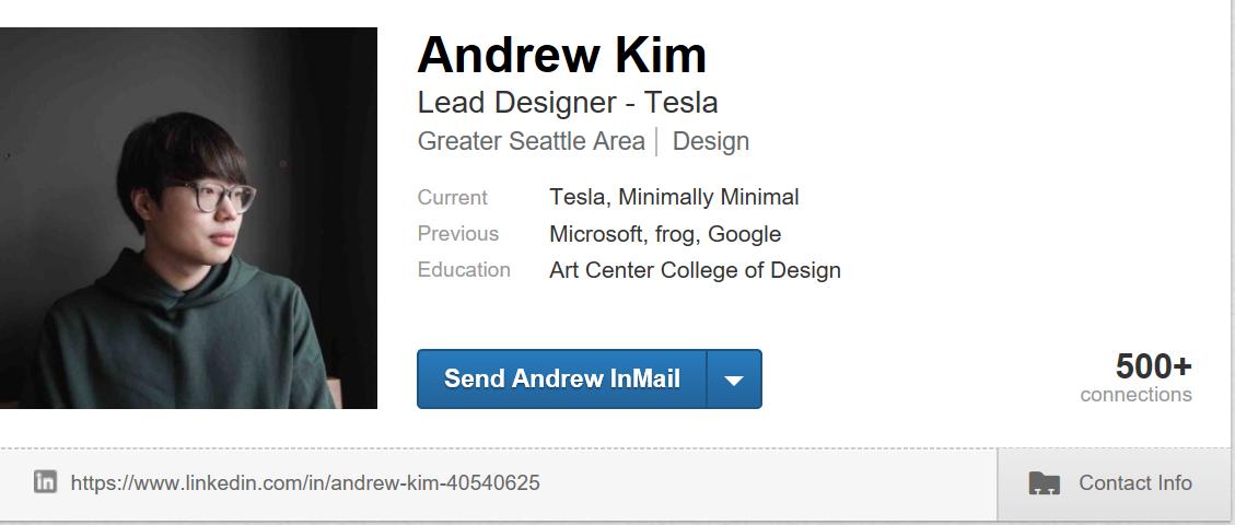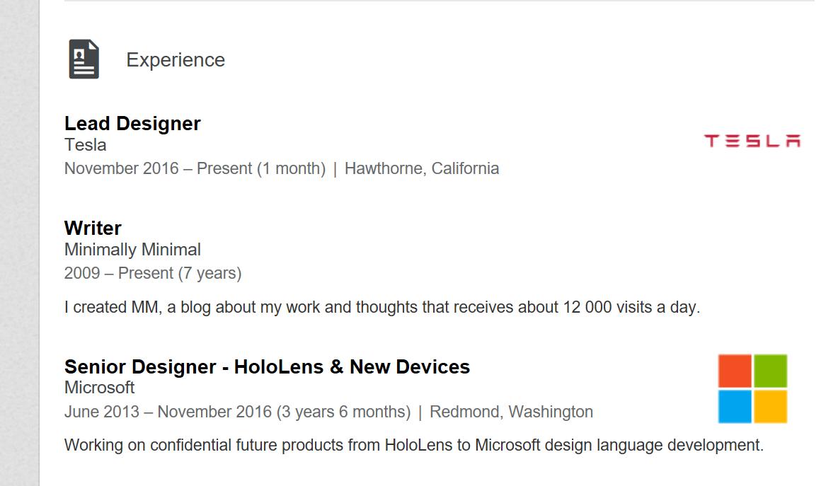 不错,这位年仅25岁就跻身顶级硬件设计师行业的年轻人来自于微软明星产品HoloLens(全息眼镜)设计部门,而且一呆就是三年半。而现在,他在LinkedIn上的头衔变成了特斯拉的首席设计师(下图)。