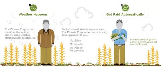 2006年成立的The Climate Corporation,通过2500万个远程传感器采集天气数据,将极端天气信息推送给农民,并推出相对应的保险业务,从而降低意外天气对农民的损失。目前已被孟山都以9.3亿美元收购。