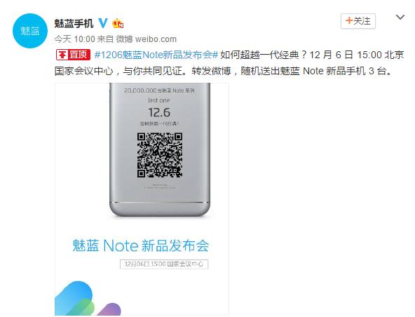然而这还不够,据魅蓝手机官方微博公告,12月6日,还有一场魅蓝Note发布会。