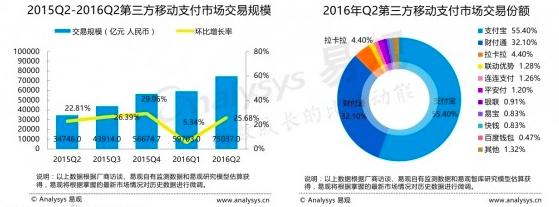 由易观的数据来看,第三方移动支付市场的交易规模持续增长,其中支付宝和财付通分别以55.40%和32.10%的市场份额占据第一二位。而主攻线下清算的银联仅占0.91%。