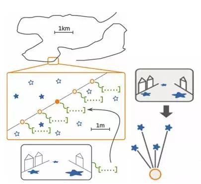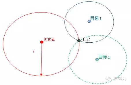 如果我们有“优衣库”的精确位置,而且能够测量出“优衣库”距离自己的精确距离,那么以“优衣库”为中心画一个圆,自己一定处于圆周之上。这时候如果我们还能确定“目标1”的精确位置和距离自己的精确距离,而且知道朝向,就可以唯一确定自己的精确位置了。这就是自定位方案最基本的原理。