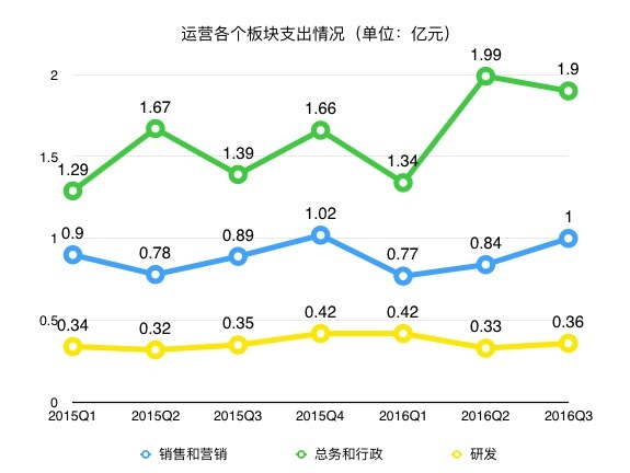 其中研发支出较稳定,销售和营销基本在0.7-1亿元范围浮动,财报指出第三季度销售和营销支出的增长主要由于劳动力成本上升,但被代理费用的下降对该增长起到部分抵消作用。在总务和行政支出方面,2016年总体情况与同期相比有所增加,2016年第三季度该部分支出增长,财报指出主要是由于员工成本增加和坏账准备金增加所致。