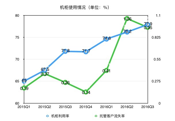 看机柜的使用情况,尽管机柜数量一直在增加,其利用率也在15年迄今逐步提升。进入2016财年,托管客户流失率相比去年整年都有所上升,至2016年第二季度达到近期最大值,在第三季度流失率有所回跌。