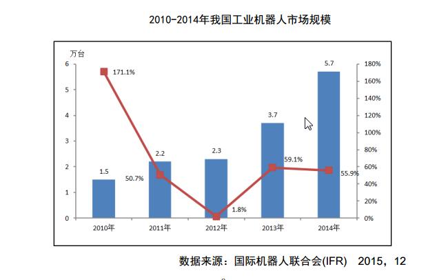 中国工业机器人市场规模达到5.7万台,约占全球销量的25%,同比增长56%。