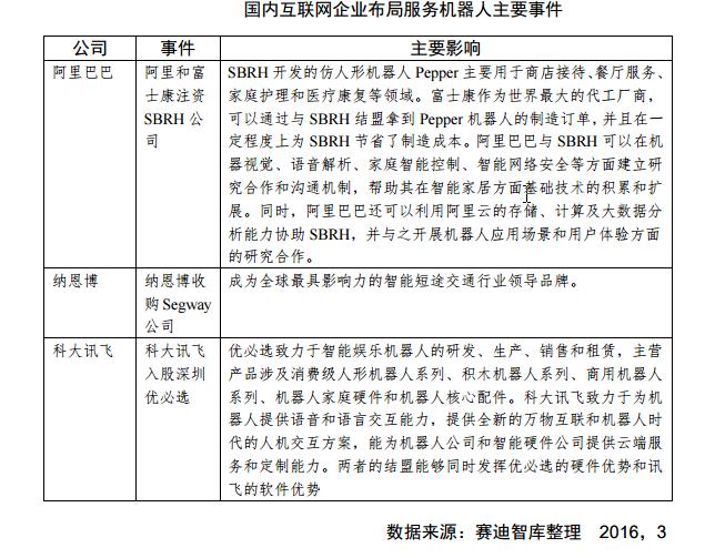 就国内而言,阿里巴巴、百度、腾讯、小米、科大讯飞等互联网企业 纷纷进军机器人行业。不过比起工业机器人,它们更加青睐于投资服务机器人领域。
