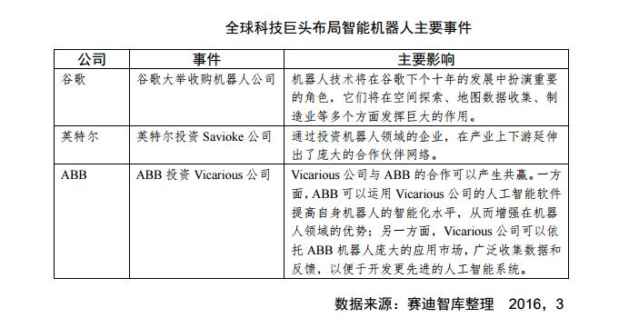 谷歌、英特尔、ABB 等科技巨头通过收购机器人公司来联合自身在人工智能方面的成果加速布局智能机器人领域。