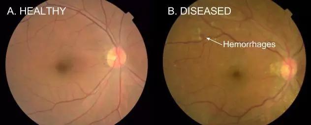 图 1:为了筛选 DR 而拍摄的视网膜眼底照片样本。左侧的图像是健康的视网膜(A),而右边的图像则是可引起糖尿病性视网膜病变的视网膜(B),可以看到存在出血状况(红点)。