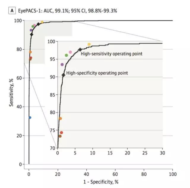 结果:EyePACS-1 数据集包含了来自 4997 位病人(平均年龄 54.4 岁)的 9963 张图像;其中 62.2% 的女性;普遍是 RDR,683/8878 完全可分级的图像(占 7.8%)。Messidor-2 数据集有来自 874 位病人(平均年龄 57.6 岁)的 1748 ;42.6% 女性;普遍是 RDR,254/1745完全可分级的图像(占 14.6%)。为了检测 RDR,该算法在 EyePACS-1 上的受试者操作曲线( ROC 曲线)下的面积为 0.991(95% CI, 0.988-0.993),在 Messidor-2 上的 ROC 曲线下的面积为 0.990 (95% CI, 0.986-0.995)。使用第一个高特异性的操作切入点(operating cut point),对于 EyePACS-1 ,灵敏度为 90.3% (95% CI, 87.5%-92.7%)、特异性为98.1%(95%CI,97.8%-98.5%)。对于 Messidor-2,灵敏度为87.0%(95%CI, 81.1%-91.0%)、特异性为98.5%(95%CI,97.7%-99.1%)。使用开发集第二个高灵敏度的操作点,对于 EyePACS-1,灵敏度为97.5%而特异性为 93.4%;对于 Messidor-2,灵敏度为 96.1%而特异性为 93.9%。