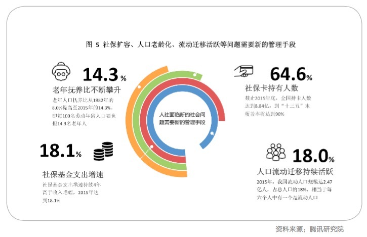 根据腾讯研究院在峰会上发布的《“互联网+人社”发展白皮书》,政策、经济、社会、技术等多方面的因素都在推动人社信息化发展。尤其是,“我国跑步进入老龄化社会,2015年65岁以上人口高达1.44亿,是世界上唯一老龄人口过亿的国家。老年抚养比不断升高将进一步加剧社保基金收支平衡压力,基金支出增速已连续4年高于收入。而活跃的人口流动迁移也在引爆社保、医保的异地业务办理需求。这些问题都需要建立一套更大容量、更统一、更精细化的社保信息系统来解决。”