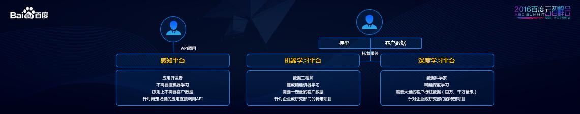 在今天举行的2016百度云智峰会上,百度正式对外发布了自己基于云的人工智能应用平台——天智。这个平台由三个部分组成,分别是感知平台、机器学习平台与深度学习平台。