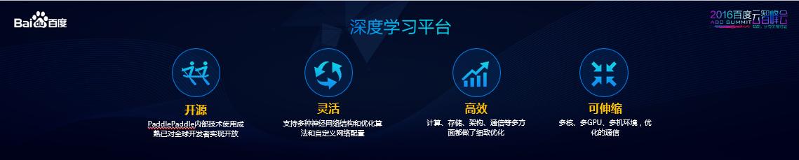 第三个平台是深度学习平台。百度在今年9月已经对深度学习框架进行开源。而今天,作为百度内部大量数据系统组成的深度学习平台,PaddlePaddle在今天也正式对全球开发者进行开放。