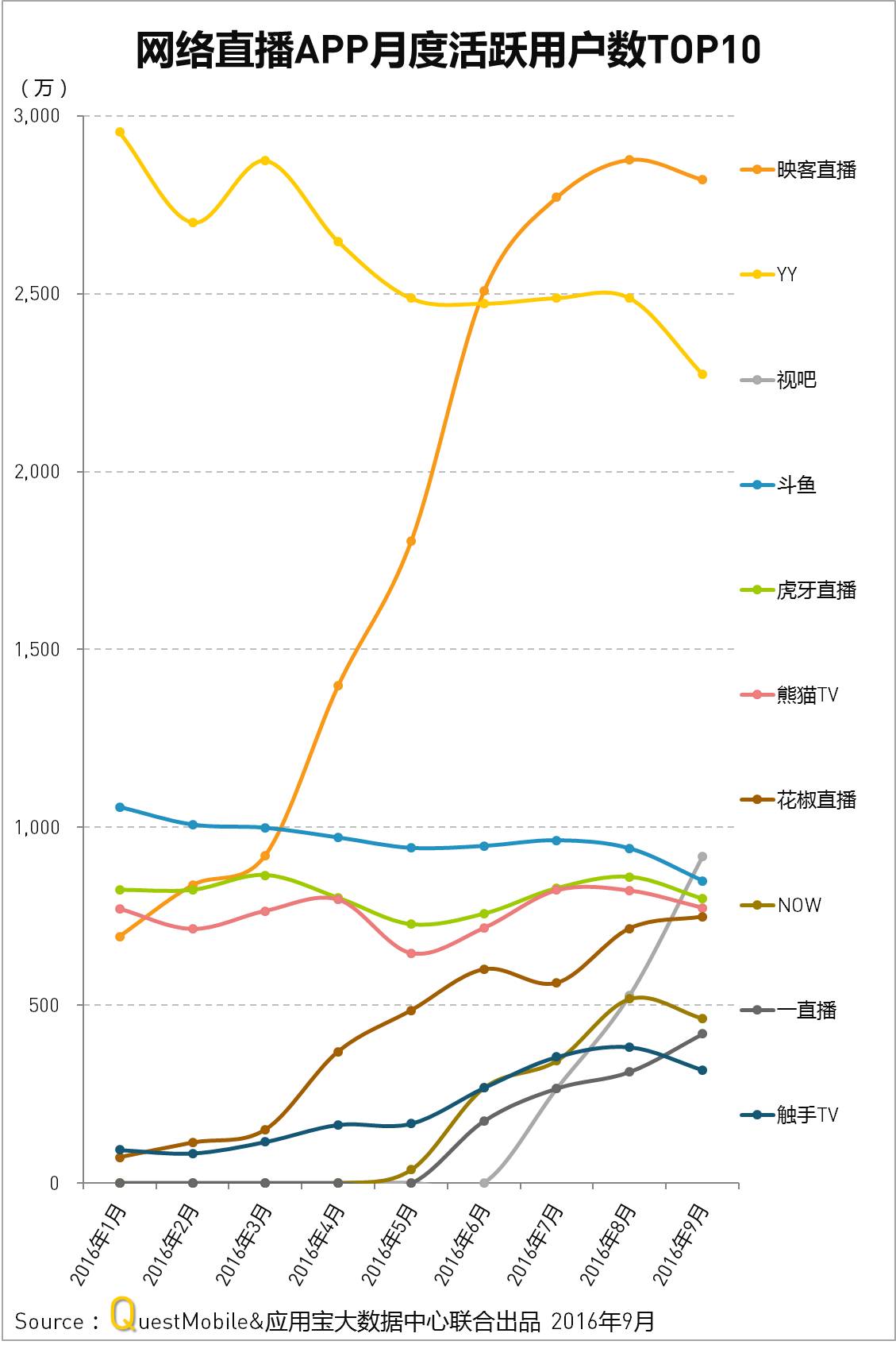 五年后,时移运转。QuestMobile 在今年9月发布的中国区直播APP数据报告显示,MAU(月活用户数)排名前五的直播平台为映客、YY、视吧、斗鱼和虎牙直播。