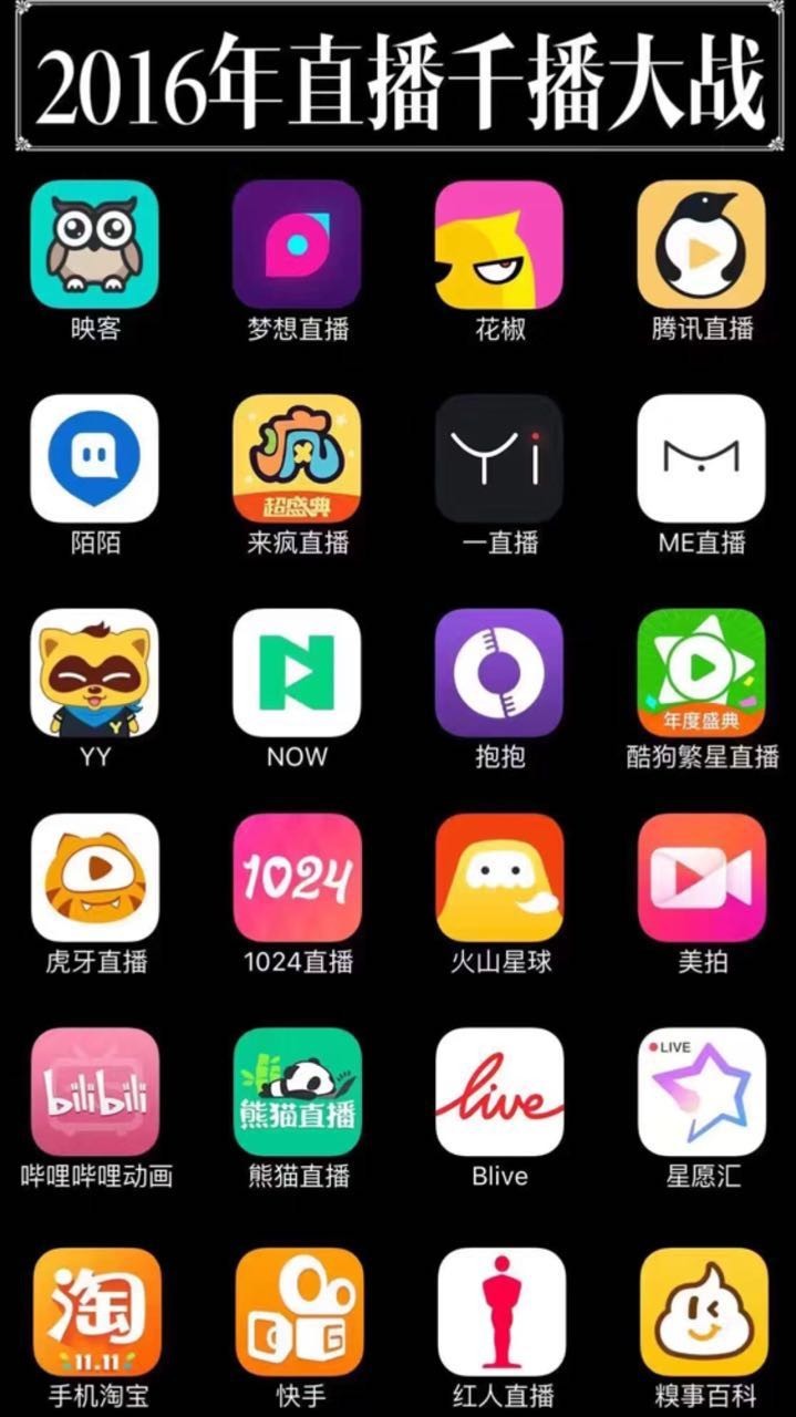 这里面,既有YY和9158这样的从PC端转战而来的秀场玩家;也有像腾讯、微博和陌陌这样的 裹挟海量用户杀入直播战局的巨头;还有映客、花椒和17这样的创业型公司。