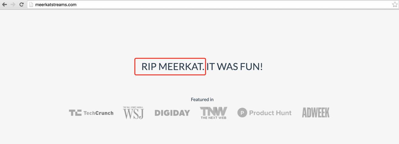2016年10月,在被Facebook和Twitter封杀的半年后,视频直播鼻祖Meerkat正式宣布自己完全放弃这一块业务,开始转战其他战场(小范围私密直播)。打开其官网,可以看到大写的RIP(Rest in Peace 逝者安息)