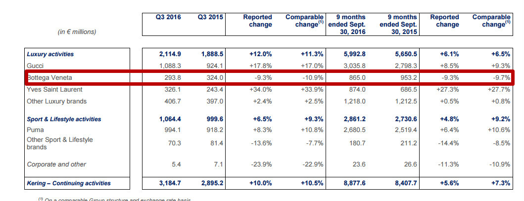 在倡导男女无差别的背后,其实是奢侈品牌们极力缩减成本的省钱招数。根据Kering此前发布的财务数据,BV在2016年前9个月销售额下降了9.7%,第三季度销售额下降了10.9%,是整个集团里表现比较差的奢侈品牌。据统计,这是BV销售额连续下跌的第四个季度,品牌一直没有复苏的迹象。