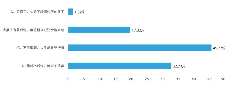 迷茫、焦虑、恐惧、孤独、无助,把创业者的心练就出了铜墙铁壁。在36氪调查的最后,问了328为创业者一个问题,“你后悔创业了吗?”但让人惊讶的是,其中323个创业者都表示不后悔,哪怕再重新来过还会这么选择。