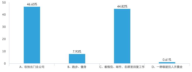 根据36氪调查,超过80%的创业者每天起来的第一件事就是回邮件,查微信,然后收拾出门去公司。三餐的时间都是奢侈的,要么用来谈业务和工作社交,要么随便对付一下,总之时间越短越好。服装搭配都是费事的,65%以上的创业者对于每天穿什么已经不在乎了。