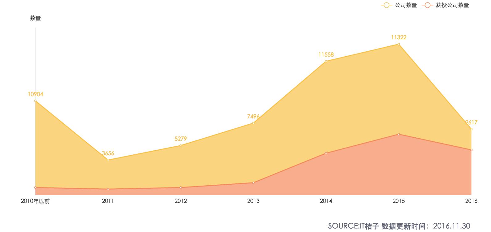 创业热潮的持续时间不超过两年。截止到2016年11月30日,整个2016年成立的创业公司只有2070家,同比下降76%。