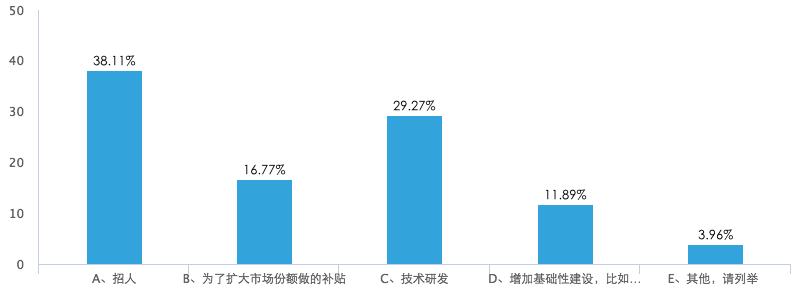成本的高涨首先体现在用人上。36氪的调查显示,38.11%的创业者在得到新融资以后,投入资金最大的地方在“招人”上,51.52%的创业者认为目前用人成本过高,压力较大。
