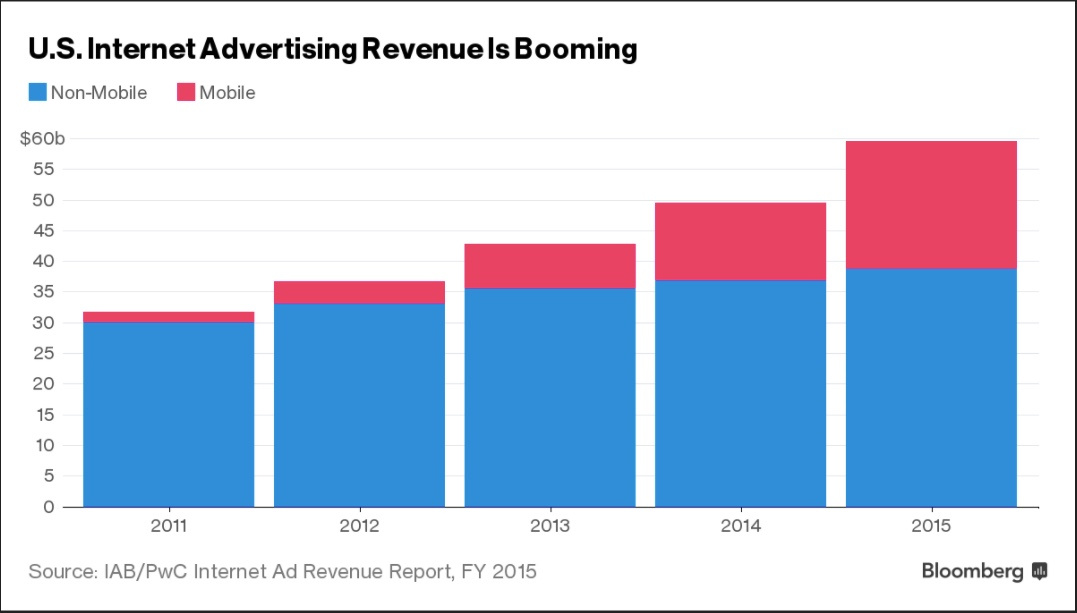 与移动搜索量的变化紧密相关的,是不断扩大的在线广告市场,而这直接关系到谷歌的钱袋子。根据Bloomberg的数据,2015年美国在线广告的市场规模达到了596亿美元,较14年增长了20%,而且这个增长主要来自于移动端。麦肯锡预测全球的数字营销市场将在2019年达到2314亿美元。而在线广告的争夺将越来越集中在移动端。