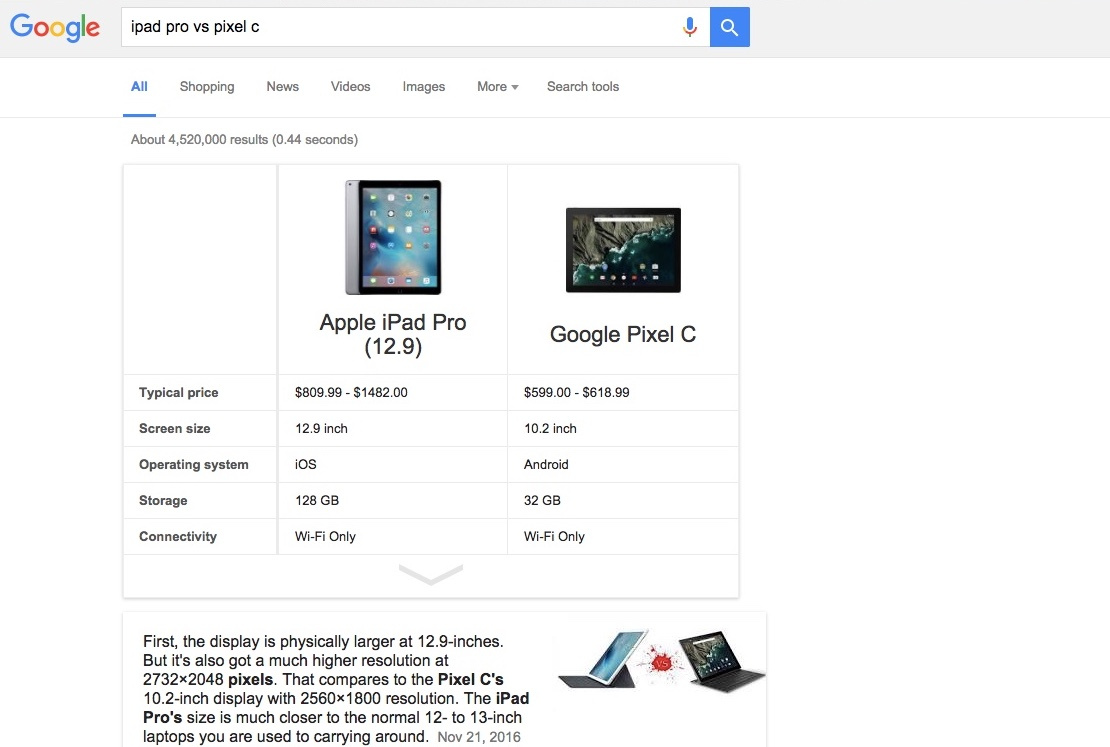 近日,谷歌搜索在其桌面端和移动端悄悄上线了一个新功能—可以在搜索结果的第一项展示两款产品的对比结果。如果你想对比Apple iPad Pro和Google Pixel C两款平板,搜索“ipad pro vs pixel c”,会出现以下结果: