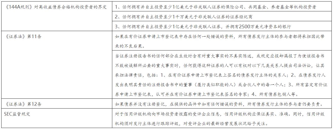 在当时美国对高收益债发行者的限制大致有两点:其一是高收益债的发行对象是被严格限制的,按照当时的法律,其只能对“不需要受强制信息披露制度保护并且‘自己可以照顾自己’的对象发行”。其二是发行人需要遵循证券法所规定的其他义务,尤其是“反欺诈法”(具体细节可见下表)。从这系列制度来看,并未有融资收购的禁行字眼,这在一定程度上也为米尔肯的高收益债融资收购形成了比较自由的制度基础。