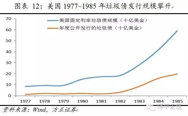 而垃圾债也在当年得到了空前的发展,80年代最初的五年时间里,年度公开发行的垃圾债规模以及固定利率垃圾债存量规模分别从17亿美元和94亿美元飙升至198亿美元和591亿美元,增幅分别高达11.6倍和6.3倍!