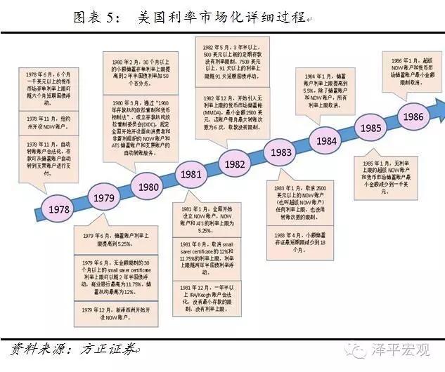 1978年,美联储规定银行发行6个月定期存款(CD),而其利率则受制于每周国债拍卖市场价格。虽然当时的CD产品存在最低限额的门槛,但存款机构的资金仍大量流入到这些监管较松的CD产品之中。其后,也在资金脱媒化的倒逼之下,美国陆续实施了“1980年存款机构放松管制以及货币控制法”、“1982年存款机构法”、“Q条例”等促成利率市场化的政策,逐步放松自动转账服务(ATS)账户、小额储蓄存单、NOW账户、货币市场储蓄账户的利率管制,直到1986年3月,客户存款利率管制被完全取消。