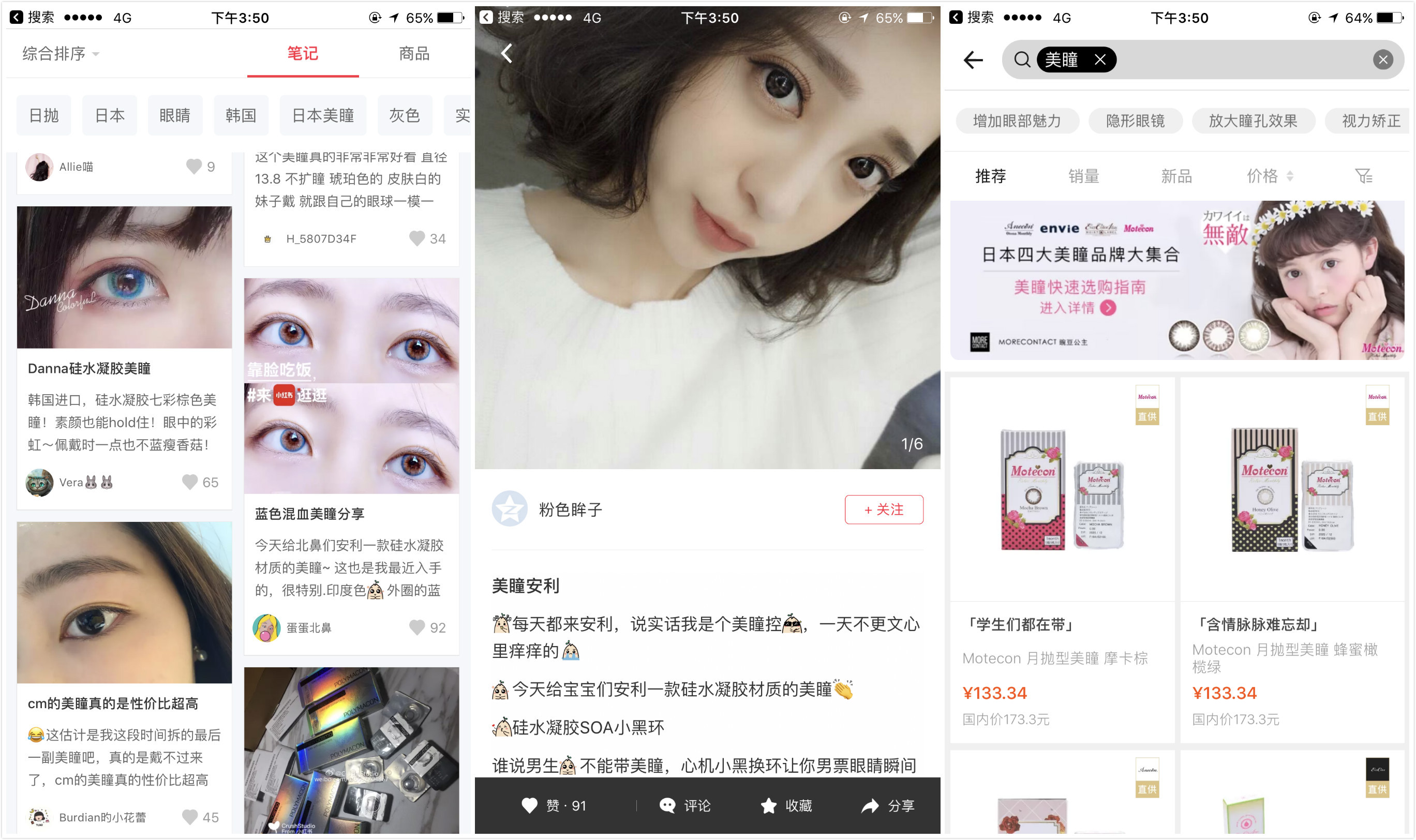 爱海淘的你可能会注意到,美瞳及周边产品出现在越来越多的平台上。日系跨境电商“豌豆公主”把美瞳列为一个单独品类,其中不乏 LILMOON、EverColor 等热门品牌;在小红书里,也可以搜到不少美瞳上眼笔记,舒适程度、颜色风格、直径大小都是被妹子们热烈探讨的话题。
