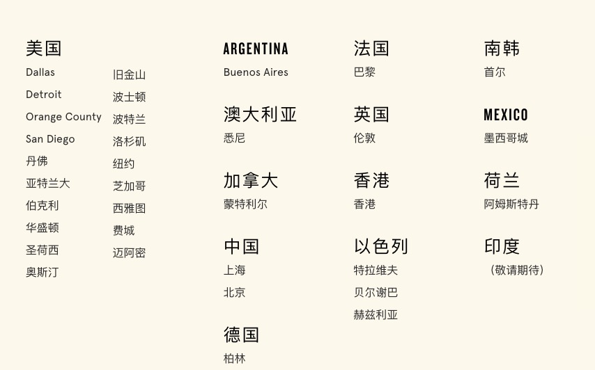 从中国内地范围而言,目前WeWork进入了上海和北京两个城市;从整个全球市场而言,进入了14个国家,34个城市,拥有138个办公场地。我们从其官网可以看到,这34个城市其中有19个城市是在美国本土。