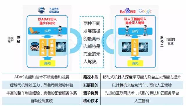 实际上,自动驾驶技术有两种发展路径。一类是由传统汽车制造商推动的高级驾驶辅助系统(ADAS)的进化;一类是由互联网巨头主导的人工智能技术,直接实现第四级的完全的自动驾驶水平。