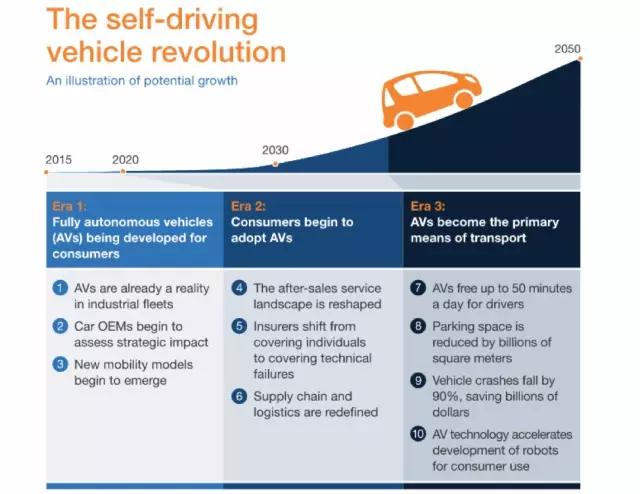 根据麦肯锡咨询的分析,未来自动驾驶的技术进步过程总体可以分为三个阶段,其中每一个阶段都会给上下游产业链带来3-4个革命性的变化。