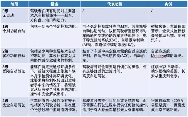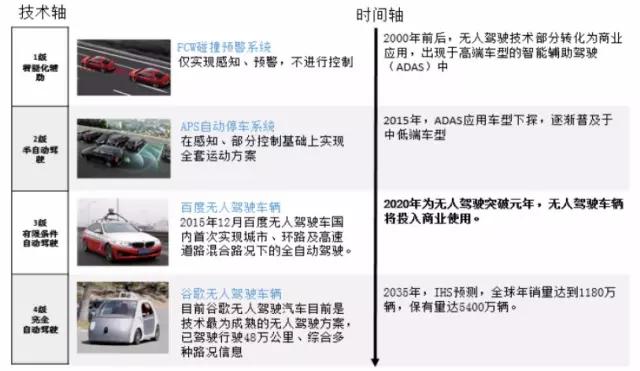 从时间维度来看,2000年前后,自动驾驶技术开始被初次地应用在了部分高端车型中,这是ADAS技术商业化的一个开端;近两年,这一技术应用开始下沉,中低端车型也开始配备了部分的ADAS技术。根据国内外多家参与自动驾驶研发制造的公司战略,2020年很可能成为高级自动驾驶技术商业化的元年,无人车至少是可以达到3级的水平。而从3级到4级之间的沟壑,就很难快速突破了,其中的壁垒包括技术壁垒、政策壁垒、法律壁垒等等。因此4级的自动驾驶等级实现的确切时间较难预测。