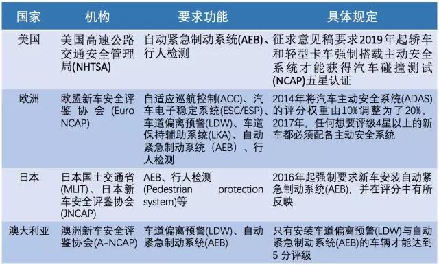 由于自动驾驶技术能够带来安全的提升、资源和效率的节约,因此引起了不少国家的重视。以国外为例,美国、日本、欧洲、澳大利亚等国家的政府纷纷出台了对汽车安全性能的新规定,明确要求新产车辆必须达到某一水准才能上市,具体标准如下: