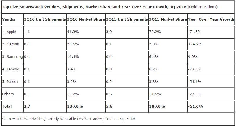 另外值得注意的是,全球智能手表的出货量,也由去年同期的560万只下降51.6%至270万只,而Lenovo和Pebble也分别出现了同比73.3%和54.1%的下滑。但是,Garmin却同比增长324.2%,市场份额跟着大涨。
