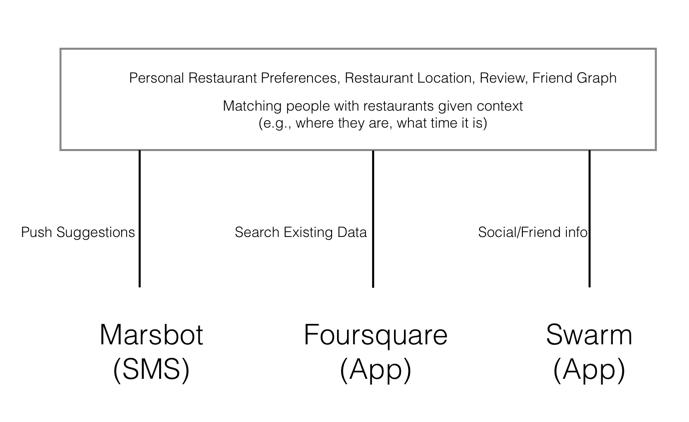 社交签到应用 Foursquare:后台的“大脑”了解每个地址的地理位置,以及曾到达某个特定位置的用户,从 Foursquare 拆分出来的 Swarm 可以提供用户所处的位置和同伴的信息。而 Foursquare 旗下的Mars Bot 是一个文本消息服务智能软件,利用 Swarm 和 Foursquare 收集的位置数据并根据用户当时所处的位置做出消费推荐。